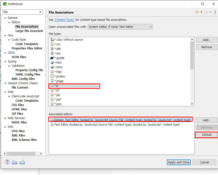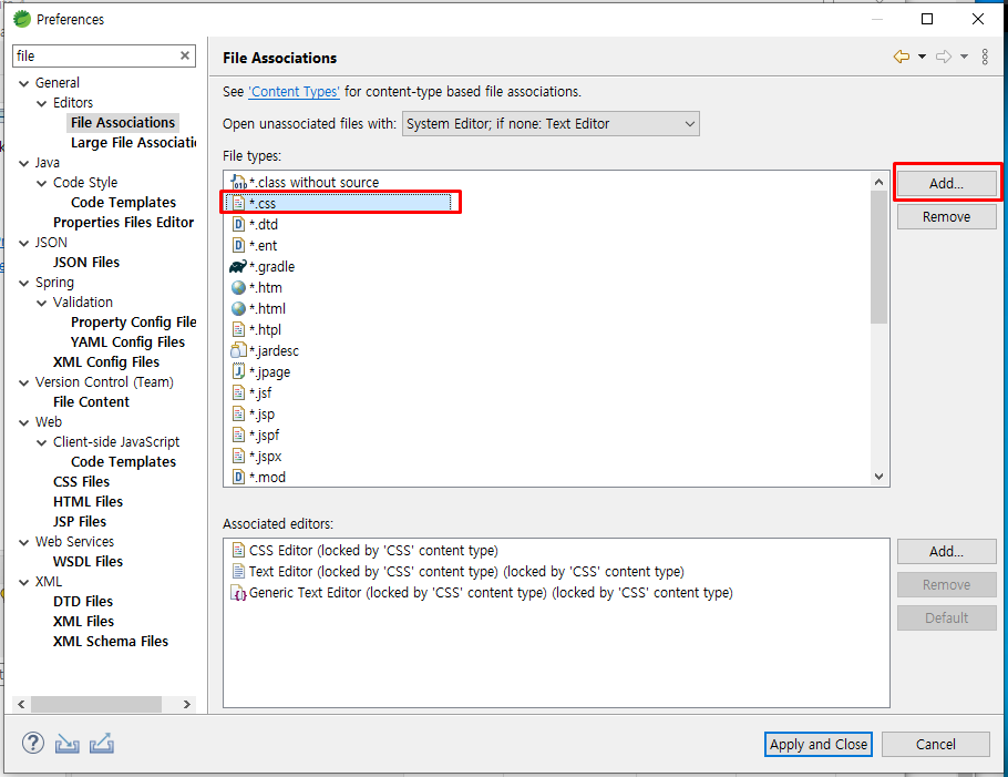 file 를 입력하면 File Associations 에서 *.css 클릭후 Add 버튼을 누른다.
