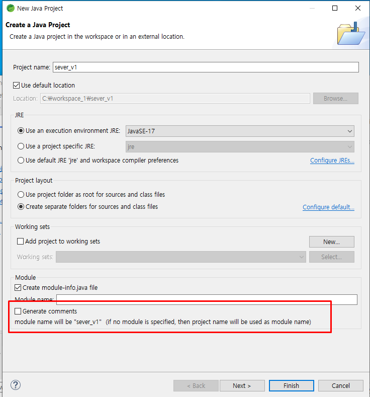 자바 프로젝트 생성 시 Generate comments 의 체크를 해제한다.
