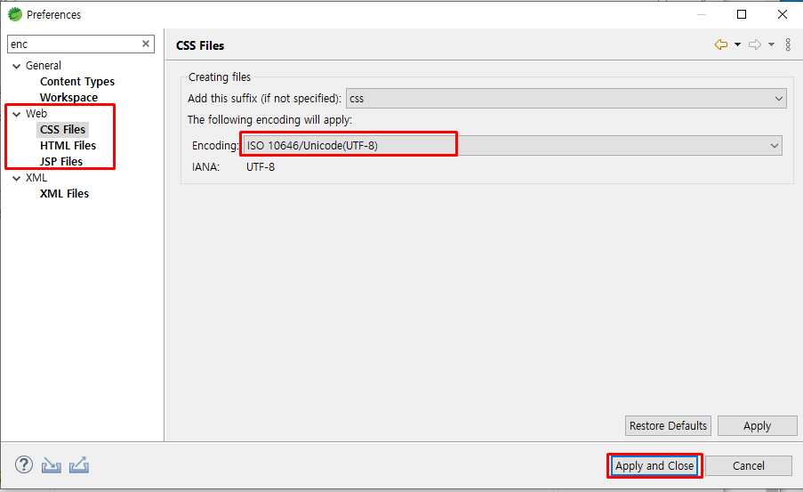 enc 를 입력하면 Web 안의 CSS Files, HTML Files, JSP Files 의 Encoding을 ISO 10646/Unlcode(UTF-8)로 변경한다.