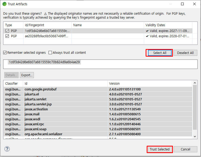 설치도중 Trusht Artifacts 창에서 Select All 클릭 후 Trust Selected를 클릭하면 설치가 마무리 된다.