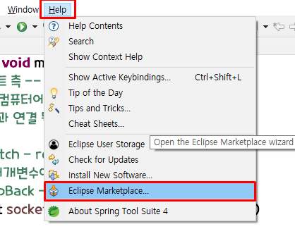 Help --> Eclipse Marketplace wizard 를 클릭한다.