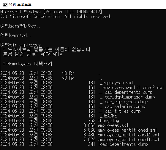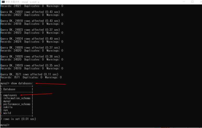 source employees.sql; 입력하면 아래의 그림과 같은 창이 뜰것이다.