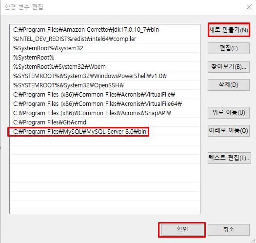 "환경변수 편집"에 들어가 새로 만들기(N) 클릭 후 경로를 붙여넣고 확인을 누른다.