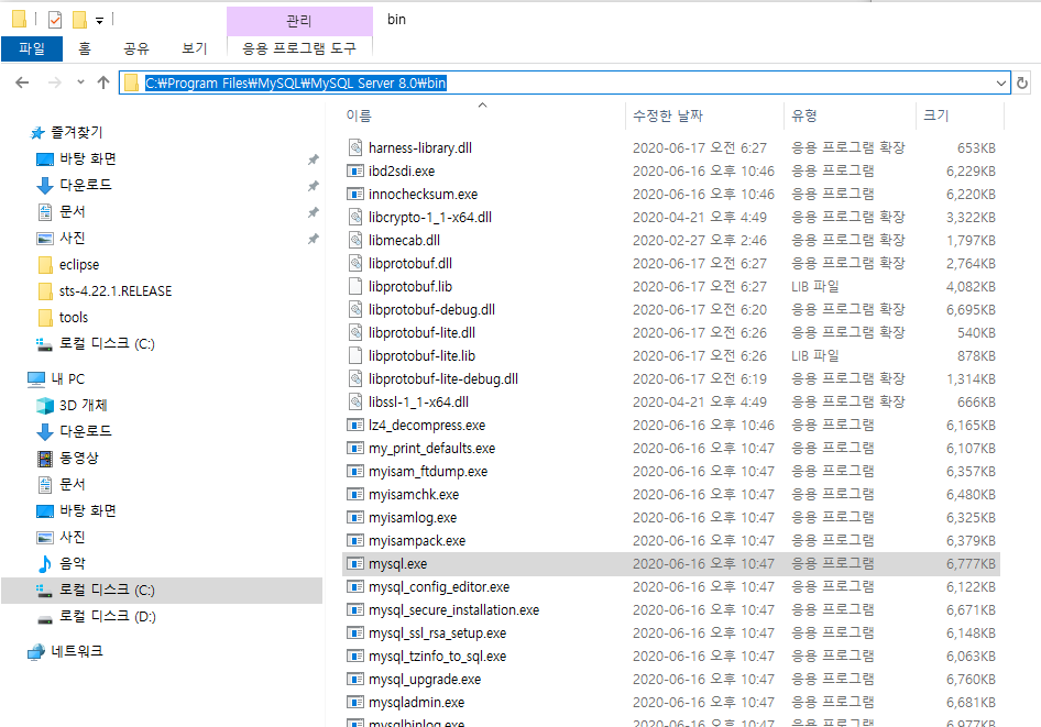 C:\Program Files\MySQL\MySQL Server 8.0\bin 폴더에 'mysql.exe' 앞까지의 주소를 복사한다. (PC 마다 다를수 있음)