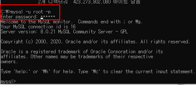 mysql를 설치할때 지정한 패스워드를 입력한다.