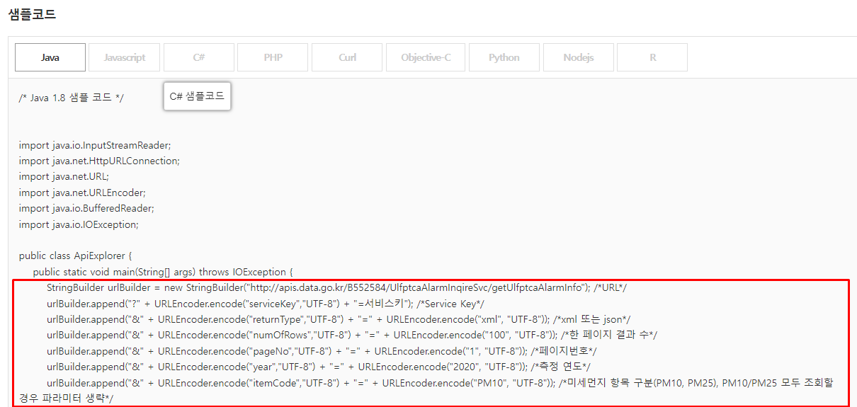 + URLEncoder.encode("PM10", "UTF-8")); /* 미세먼지 항목 구분(PM10, PM25), PM10/PM25 모두 조회할 경우 파라미터 생략 */