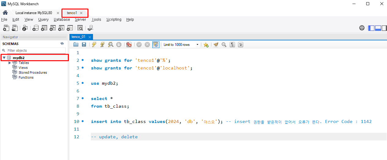 'tenco1'@'%'로 설정된 권한으로 localhost에서 접속하려 할 때 문제가 발생할 수 있습니다.