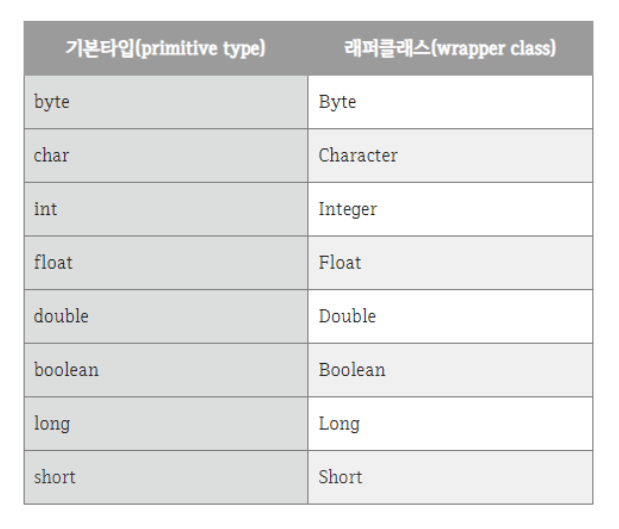 이럴 때 기본 자료타입(primitive type)을 객체로 다루기 위해서 사용하는 클래스들을 래퍼 클래스(wrapper class)라고 함