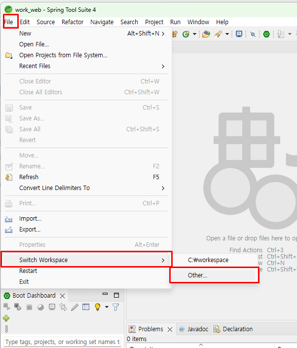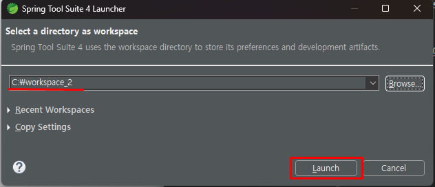 Browse 를 클릭하면 새로운 workspace 폴더를 선택한다.
