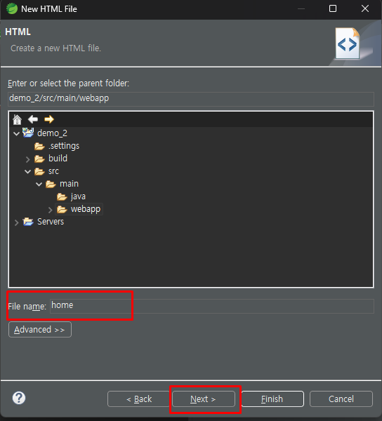 파일 이름을 home으로 적고 Next 를 클릭한다.