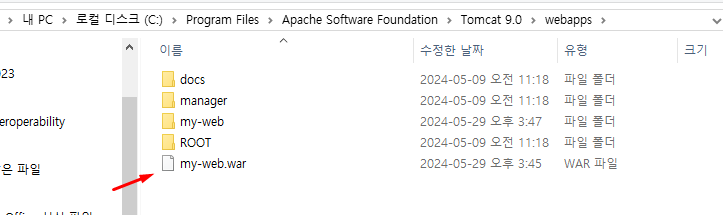 war 파일 복사 후 C:\Program Files\Apache Software Foundation\Tomcat 10.1\webapps 에 붙여넣기 한다.