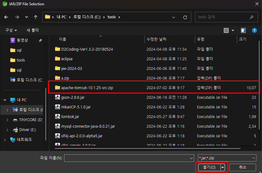 tools 폴더에 들어가서 아까전에 다운받은 zip 폴더를 클릭후 열기 버튼을 누른다.
