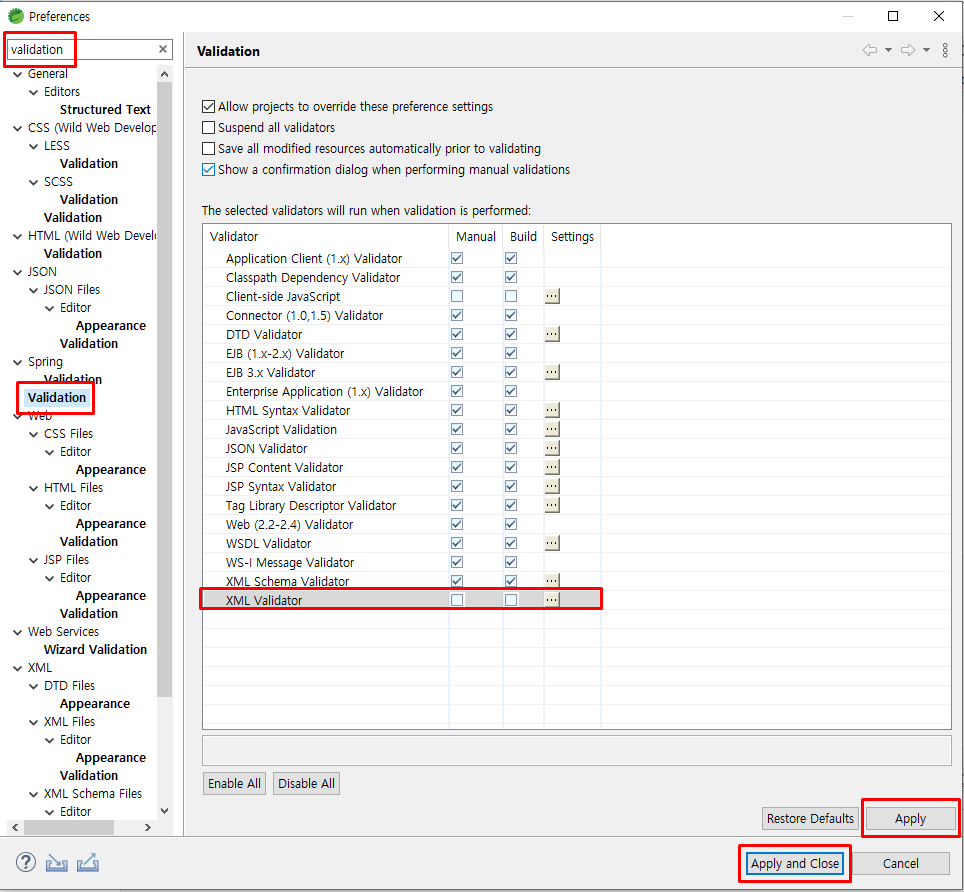 그리고 XML Validator의 Manual Build의 클릭을 해제한다.