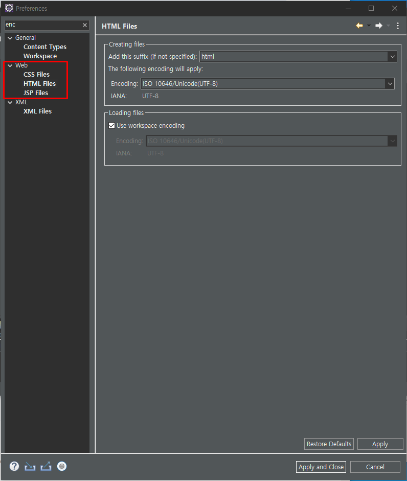 preferences —> 검색 창 “enc” —> Web 그룹 모두 Encoding : ISO 10646/Unicode(UTF-8)로 설정
