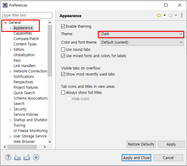window —> Preferences() 클릭 —> General —> Appearance —> Theme : dark 설정