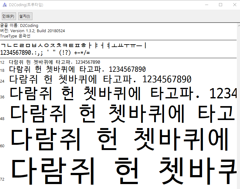 D2Coding-Ver1.3.2-20180524.ttf 경로로 들어가 설치버튼을 누른다.