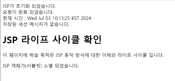 <p>이 페이지에 학습 목적은 JSP 동작 방식에 대한 이해와 라이프 사이클 입니다.</p>
