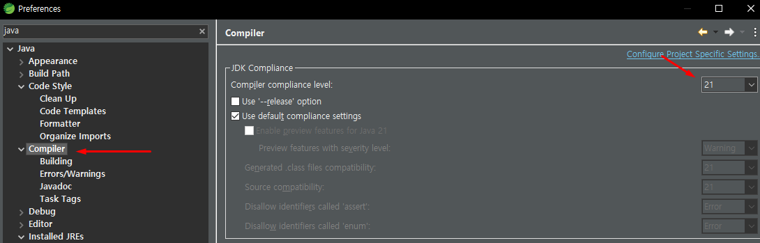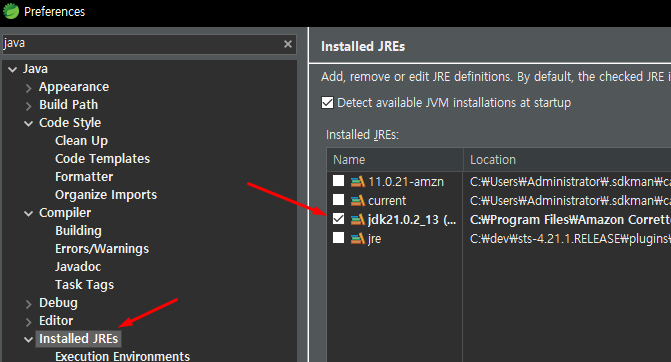 Java 컴파일러 버전과(21) 인스톨되어 있는 JRE 버전을 맞춰 주세요