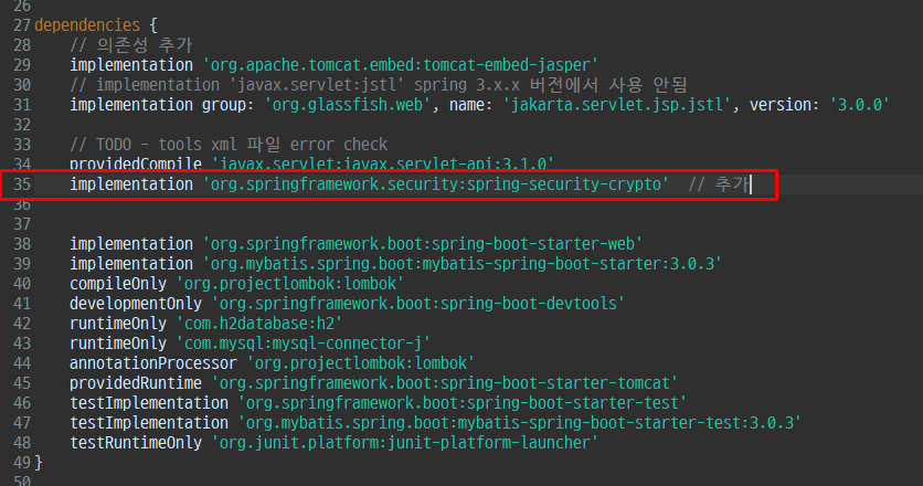 1. SpringSecurityCrypto 의존성 추가 및 BCryptPasswordEncoder 빈 클래스로 등록