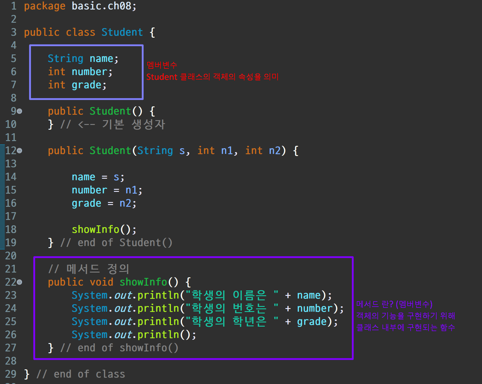 클래스는 객체의 상태를 나타내는 필드(변수)와 객체의 행동을 정의하는 메서드로 구성