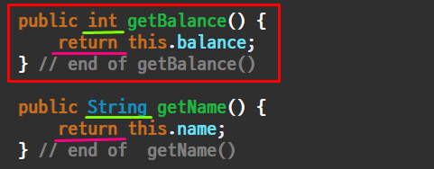 int getMoney = bank1.withdraw(10_000); // return 타입 값이 money 이다.
