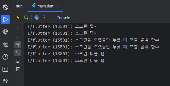 - GestureDetector 자체는 화면에 표시되지 않으며, child에 지정된 위젯에 사용자 이벤트가 발생할 때 이벤트를 처리할 수 있습니다.