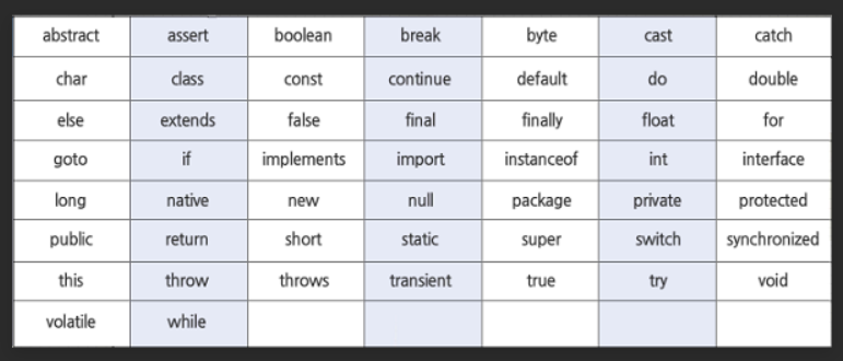 자바언어에서 미리 선점한 키워드 (변수 이름으로 사용할 수 없다.)